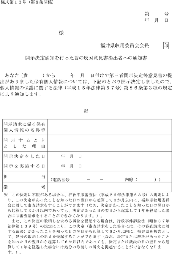 4 法第86条第3項の書面は、開示決定通知を行った旨の反対意見書提出者への通知書(