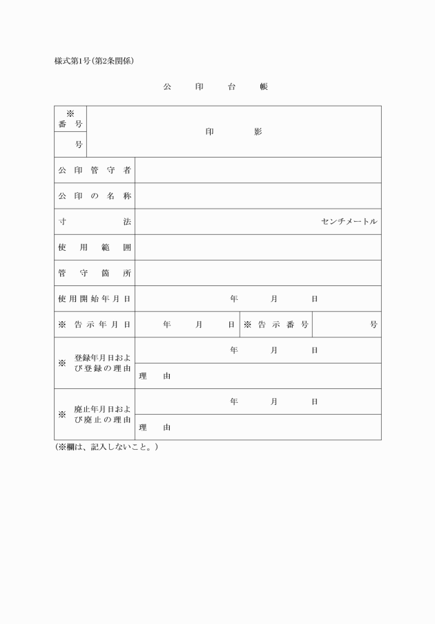 (2) 公印台帳(様式第1号)を備え、公印の種類、印影、使用範囲その他必要な事項を登録しておくこと。