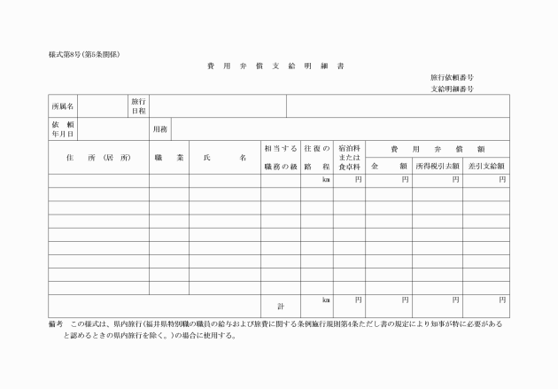 第8条 特別職条例第6条第3項の規定によるその他の特別職の職員の費用の弁償の額は、行政職給料表の4級の職務にある一般職員の例による。ただし、知事が特に必要があると認めるときは、この限りでない。