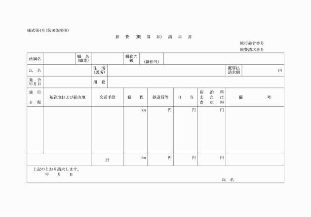 4 第6条に規定する旅費を請求する場合 | 請求者の所属名および職名および氏名(これらについては、請求者が職員である場合に限る。) 請求者の住所、職員との続柄および氏名(これらについては、請求者が遺族である場合に限る。) 請求者の所属団体、役職および氏名(これらについては、請求者が職員および遺族以外である場合に限る。) 請求額 種目および金額 損失の事由 請求年月日 |