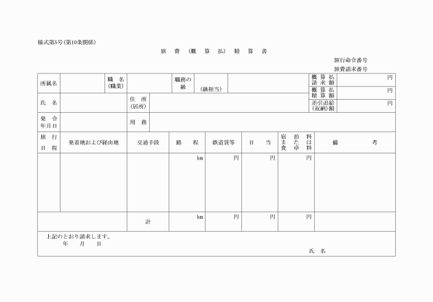 1 2の項から5の項までの左欄に掲げる場合以外の場合 | 請求者の所属名、職名および氏名 旅行開始日、旅行終了日および宿泊日 出発地、経路、到着地、宿泊地、種目およびその金額 請求年月日 発令年月日 用務 概算額、精算額、追給額および返納額(これらについては、概算払に係る旅費を請求する場合に限る。以下この表において同じ。) |