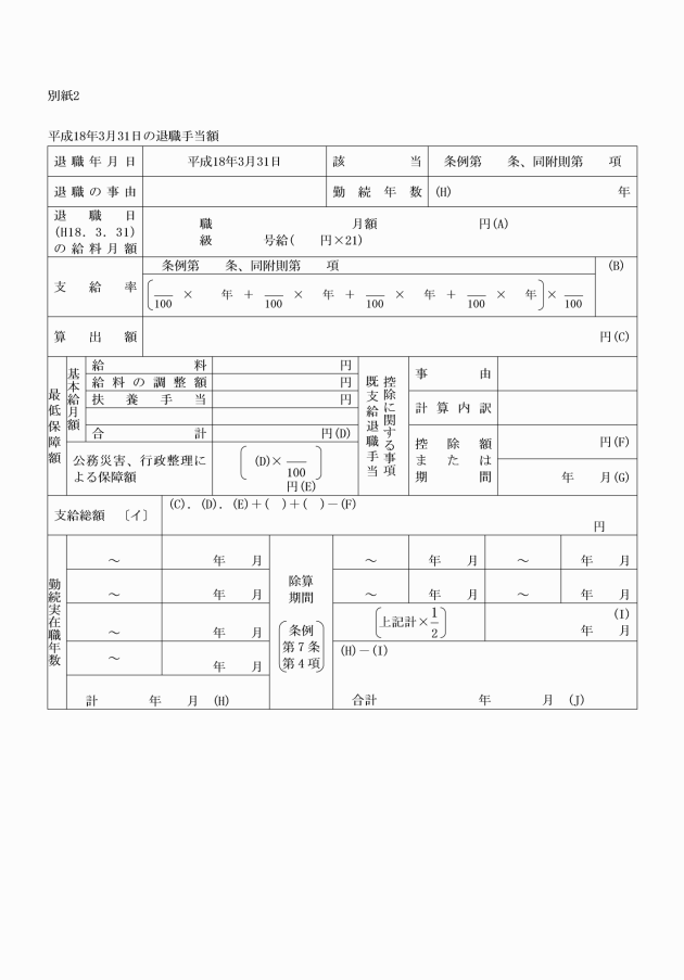 第2号区分 | 1 平成18年4月以後平成19年3月以前の給与条例の行政職給料表の適用を受けていた者でその属する職務の級が8級であったもの 2 平成19年4月以後の給与条例の行政職給料表の適用を受けていた者でその属する職務の級が8級であったもの 3 平成18年4月以後平成19年3月以前の給与条例の警察職給料表の適用を受けていた者でその属する職務の級が9級であったもの 4 平成19年4月以後の給与条例の警察職給料表の適用を受けていた者でその属する職務の級が9級であったもの 5 平成18年4月以後平成19年3月以前の給与条例の教育職給料表(1)の適用を受けていた者でその属する職務の級が5級であったもの(人事委員会が別に定めるものに限る。) 6 平成18年4月以後平成19年3月以前の給与条例の教育職給料表(2)の適用を受けていた者でその属する職務の級が4級であったもの(人事委員会が別に定めるものに限る。) 7 平成19年4月以後の給与条例の教育職給料表(1)の適用を受けていた者でその属する職務の級が4級であったもの(人事委員会が別に定めるものに限る。) 8 平成18年4月以後平成19年3月以前の給与条例の教育職給料表(3)の適用を受けていた者でその属する職務の級が4級であったもの(人事委員会が別に定めるものに限る。) 9 平成19年4月以後の給与条例の教育職給料表(2)の適用を受けていた者でその属する職務の級が4級であったもの(人事委員会が別に定めるものに限る。) 10 平成18年4月以後平成19年3月以前の給与条例の研究職給料表の適用を受けていた者でその属する職務の級が5級であったもの(人事委員会が別に定めるものに限る。) 11 平成19年4月以後の給与条例の研究職給料表の適用を受けていた者でその属する職務の級が5級であったもの(人事委員会が別に定めるものに限る。) 12 平成18年4月以後平成19年3月以前の給与条例の医療職給料表(1)の適用を受けていた者でその属する職務の級が4級であったもの(人事委員会が別に定めるものに限る。) 13 平成19年4月以後の給与条例の医療職給料表(1)の適用を受けていた者でその属する職務の級が4級であったもの(人事委員会が別に定めるものに限る。) 14 平成18年4月以後平成19年3月以前の給与条例の医療職給料表(2)の適用を受けていた者でその属する職務の級が7級であったもの(人事委員会が別に定めるものに限る。) 15 平成19年4月以後の給与条例の医療職給料表(2)の適用を受けていた者でその属する職務の級が7級であったもの(人事委員会が別に定めるものに限る。) 16 平成18年4月以後平成19年3月以前の給与条例の医療職給料表(3)の適用を受けていた者でその属する職務の級が7級であったもの(人事委員会が別に定めるものに限る。) 17 平成19年4月以後の給与条例の医療職給料表(3)の適用を受けていた者でその属する職務の級が7級であったもの(人事委員会が別に定めるものに限る。) 18 平成18年4月以後の任期付職員条例第7条第1項の給料表の適用を受けていた者で同表5号給の給料月額を受けていたもの 19 特定任命により職員となった者のうち、平成18年4月以後の一般職給与法の公安職給料表(1)の適用を受けていた者でその属する職務の級が9級であったもの |