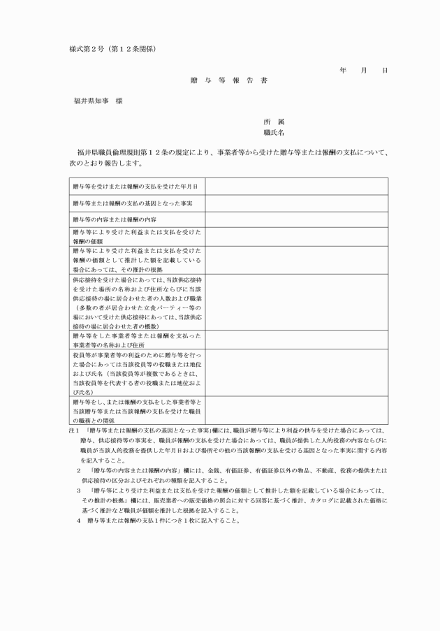 第12条 管理職員は、事業者等から、金銭、物品その他の財産上の利益の供与もしくは供応接待(以下「贈与等」という。)を受けたときまたは事業者等と当該管理職員の職務との関係に基づいて提供する人的役務に対する報酬として、利害関係者に該当する事業者等から講演等の報酬の支払を受けたとき、もしくは利害関係者に該当しない事業者等から当該管理職員の現在または過去の職務に関係する事項に関する講演等の報酬の支払を受けたとき(当該贈与等により受けた利益または当該支払を受けた報酬の価額が1件につき5,000円を超える場合に限る。)は、1月から3月まで、4月から6月まで、7月から9月までおよび10月から12月までの各区分による期間(以下「四半期」という。)ごとに、贈与等報告書(様式第2号)を、当該四半期の翌四半期の初日から14日以内に、知事に提出しなければならない。