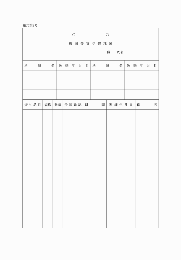 第11条 所属長は、被服等貸与整理簿(様式第2号)を備え、被服等の貸与明細を記録し、保管しておかなければならない。