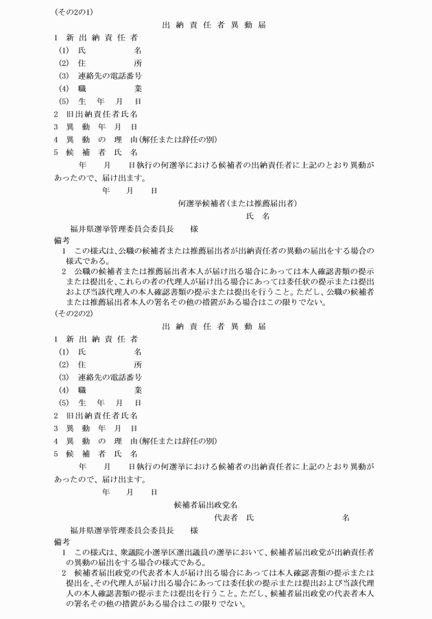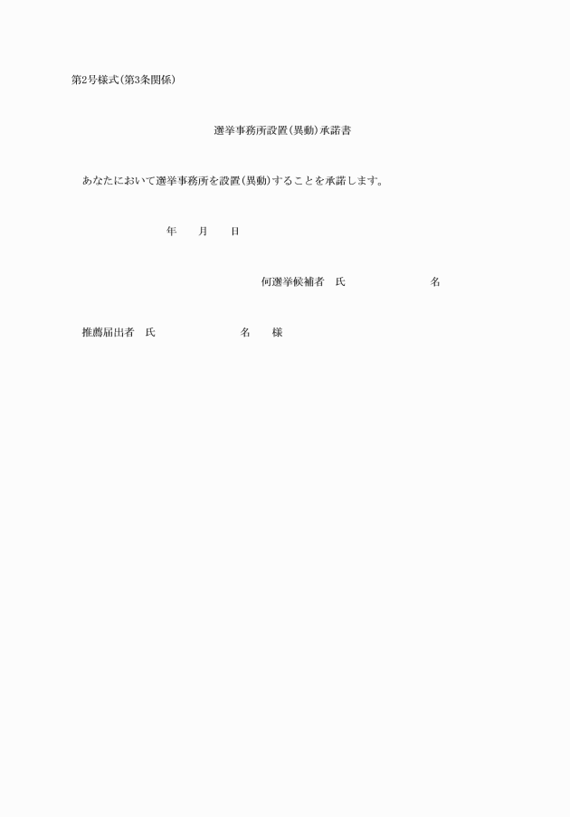 第3条 衆議院小選挙区選出議員もしくは参議院選挙区選出議員または県の選挙における法第130条第2項の規定による選挙事務所の設置または異動の届出は、別記第1号様式によりしなければならない。