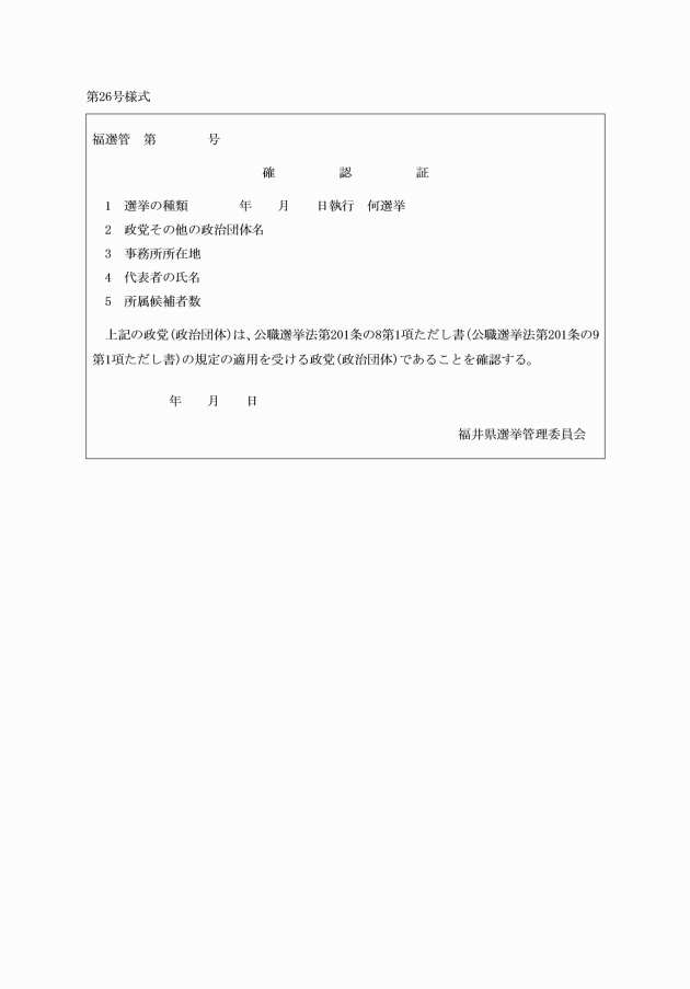 第3条の2 衆議院小選挙区選出議員、参議院選挙区選出議員または知事の選挙において、法第130条第1項第1号または第4号に掲げるものが設置する選挙事務所に掲示する標札で、法第131条第3項の規定により福井県選挙管理委員会(以下「県の委員会」という。)が交付するもの(以下この条において「標札」という。)は、別記第4号様式による。