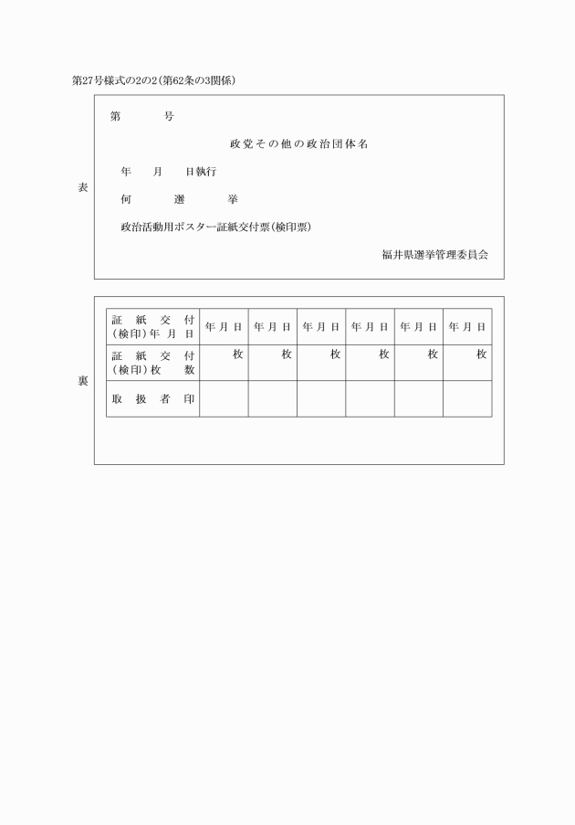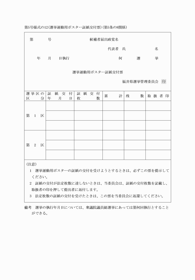 2 前項の選挙運動用ポスターの証紙の交付を受けようとする者は、あらかじめ、県の委員会から別記第5号様式の12による選挙運動用ポスター証紙交付票(以下この章において「ポスター証紙交付票」という。)の交付を受けなければならない。
