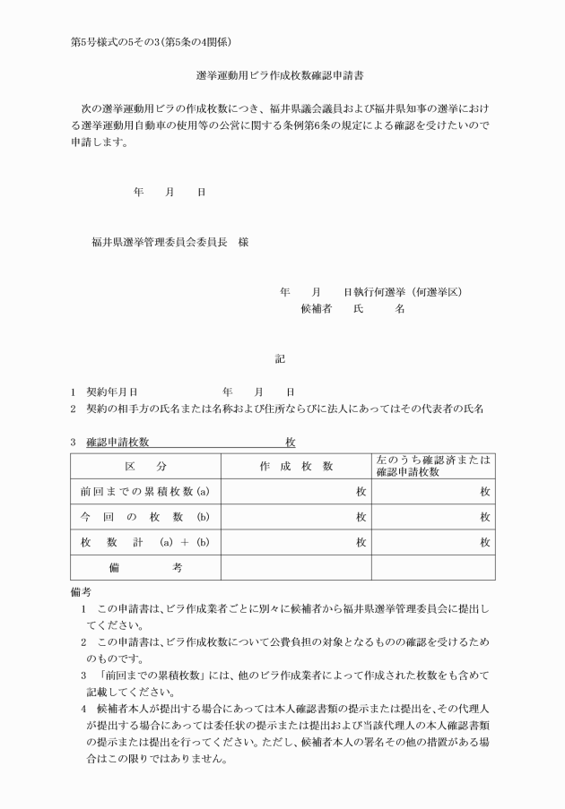 第5条の3 福井県議会議員および福井県知事の選挙における選挙運動用自動車の使用等の公営に関する条例(平成6年福井県条例第2号。以下この章において「公営条例」という。)第2条または第2条の2の規定の適用を受けようとする者は、公営条例第3条に規定する契約を締結した場合には、直ちに(立候補の届出前に当該契約を締結した場合には、立候補の届出後直ちに)、当該契約に関する書面の写しを添えて、同条の規定による届出をしなければならない。