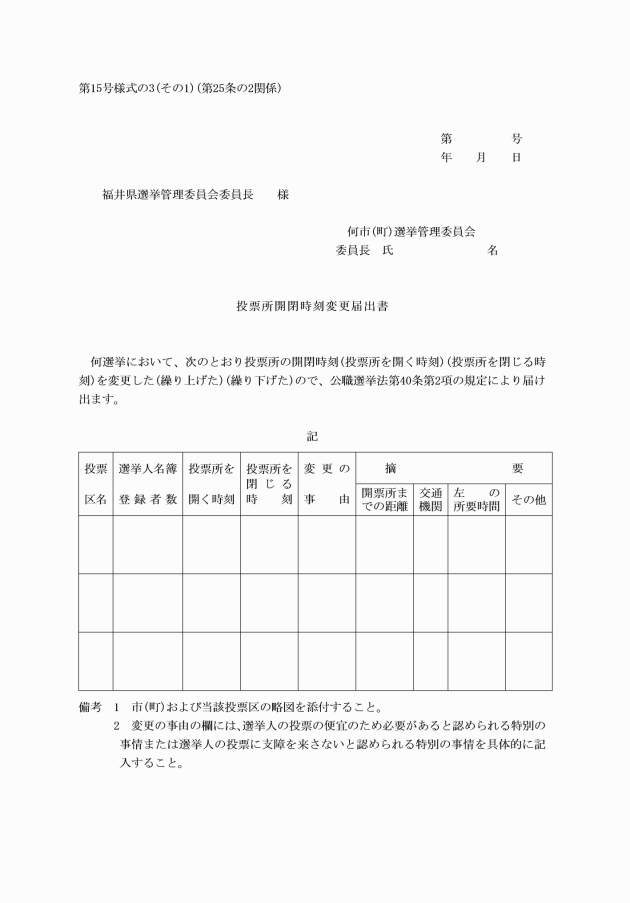 第5条 市町の選挙管理委員会(以下「市町の委員会」という。)は、法第17条第2項の規定により投票区を設けたときは、別記第1号様式による通知書に同条第3項の規定による告示の写しを添えて、県の委員会に通知するものとする。既に設けた投票区を変更し、もしくは廃止し、またはその名称を変更したときも、また同様とする。