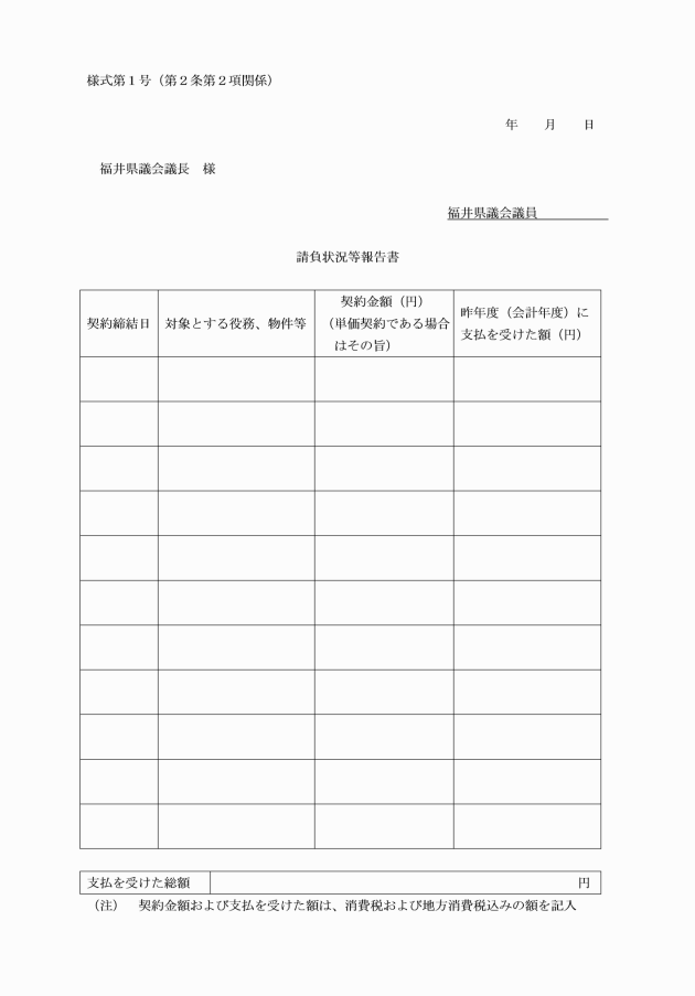 第2条 議員は、毎年6月1日から同月30日までの間(当該期間内に任期満了または議会の解散による任期終了により議員でない期間がある者で当該任期満了または議会の解散による選挙により再び議員となったものにあっては、再び議員となった日から起算して30日を経過する日までの間)に、当該6月30日の属する会計年度の前会計年度(議員である期間に限る。第1号エにおいて同じ。)における福井県に対する請負(当該前会計年度において支払を受けたものに限る。)について、議長に対し、次に掲げる事項を報告しなければならない。