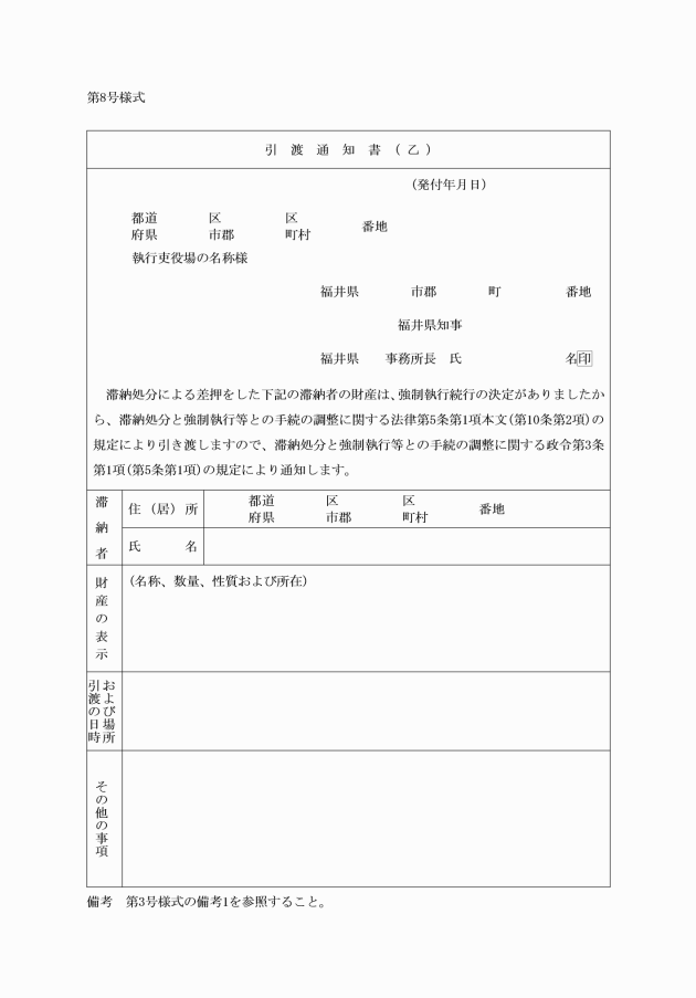第6条 政令第5条第1項において準用する政令第3条第1項の規定による書面は、第8号様式(引渡通知書(乙))による。