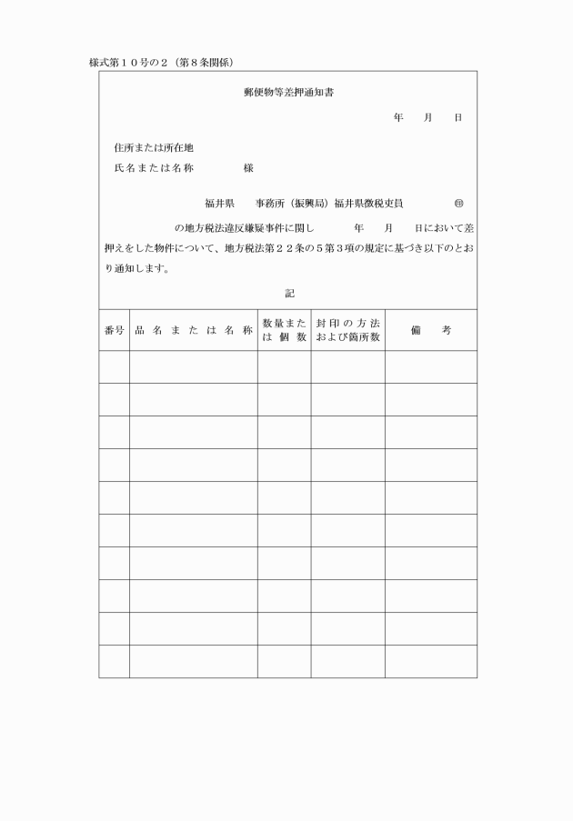 2 徴税吏員は、法第22条の5第3項の規定により、通信事務を取り扱う者が保管し、または所持する郵便物、信書便物または電信についての書類を差し押さえた旨の通知をするときは、別記様式第10号の2による通知書により行わなければならない。