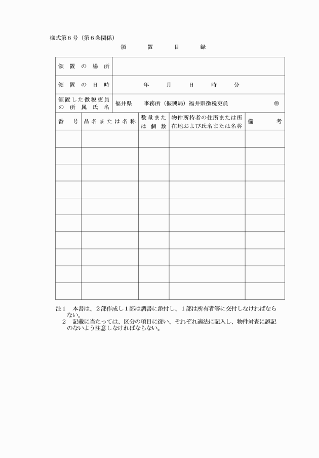 第4条 徴税吏員は、法第22条の3第1項の規定により嫌疑者もしくは参考人が所持し、または置き去った物件を検査したときは、別記様式第2号による検査調書を作成しなければならない。
