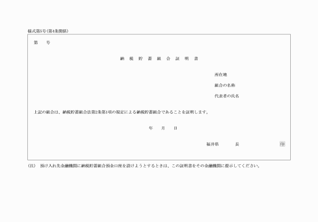 第2条 知事は、法第2条第1項の規定による組合の規約の届出、法第10条の2の規定による連合会(組合を直接の会員とし、県内に主たる事務所を有する連合会(以下「地区連合会」という。)を直接の会員とする福井県納税貯蓄組合総連合会(以下「総連合会」という。)を除く。以下この条および次条において同じ。)の規約の届出および法第13条の規定による解散の届出の受理ならびに納税貯蓄組合法施行令(昭和26年政令第99号。以下「政令」という。)第2条第1項に規定する証明書の交付については、当該組合または当該連合会の主たる事務所の所在地を管轄する福井県税事務所または嶺南振興局の長(以下「県税事務所等の長」という。)に、その権限を委任する。
