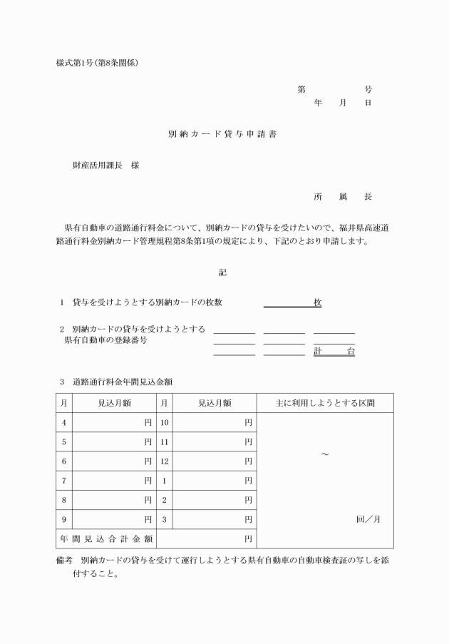 第5条 供用自動車の使用に係る道路通行料金については、別納カードにより納付するものとし、別納カードを利用して供用自動車を使用しようとする者は、あらかじめ財産活用課長にその旨を申請し、その承認を受けなければならない。