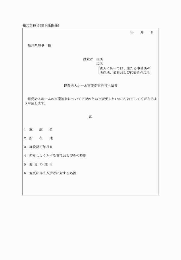 第14条 社会福祉法第63条第1項の規定による軽費老人ホームに係る変更の届出は、軽費老人ホーム事業変更届(様式第18号)によらなければならない。