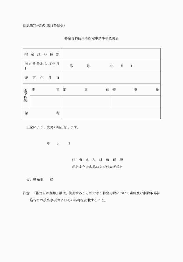 2 政令第16条第1号または第22条第1号の規定による特定毒物使用者の指定を受けようとする者は、別記第5号様式による申請書に次に掲げる書類を添えて、知事に提出しなければならない。