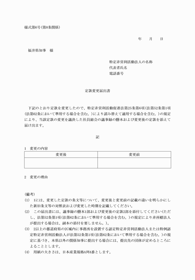 第8条 法第25条第6項の規定による届出は、定款変更届出書(様式第6号)によりするものとする。