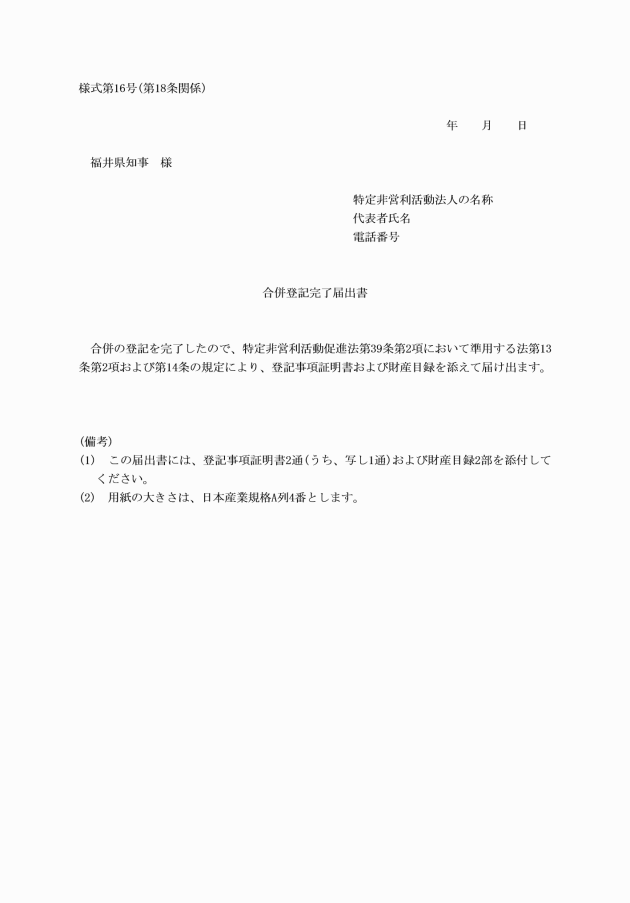第18条 法第39条第2項において準用する法第13条第2項の規定による届出は、合併登記完了届出書(様式第16号)によるものとする。