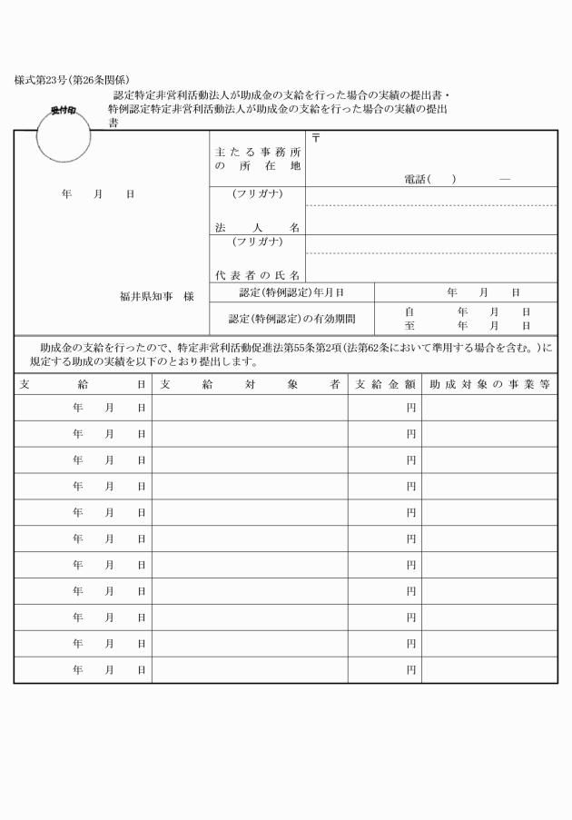 第26条 法第55条第2項(法第62条において準用する場合を含む。)の規定による提出は、認定特定非営利活動法人が助成金の支給を行った場合の実績の提出書・特例認定特定非営利活動法人が助成金の支給を行った場合の実績の提出書(様式第23号)によりするものとする。