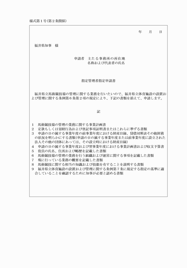 第1条 この規則は、福井県立体育施設の設置および管理に関する条例(昭和48年福井県条例第6号。以下「条例」という。)第21条の規定に基づき、福井県立馬術競技場(以下「馬術競技場」という。)の管理および運営に関し必要な事項を定めるものとする。