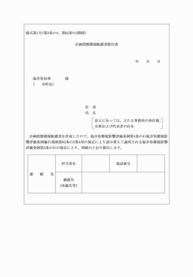 第3条の4 条例第4条の4の規定による配慮書の提出は、計画段階環境配慮書提出書(様式第1号)に配慮書を添えてするものとする。