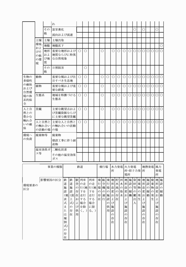 環境影響評価の対象とする環境要素は、別表第1に掲げるとおりとする。なお、事業の内容ならびに事業を実施しようとする区域およびその周囲の自然的社会的状況を勘案して、必要に応じ環境要素を追加するものとする。