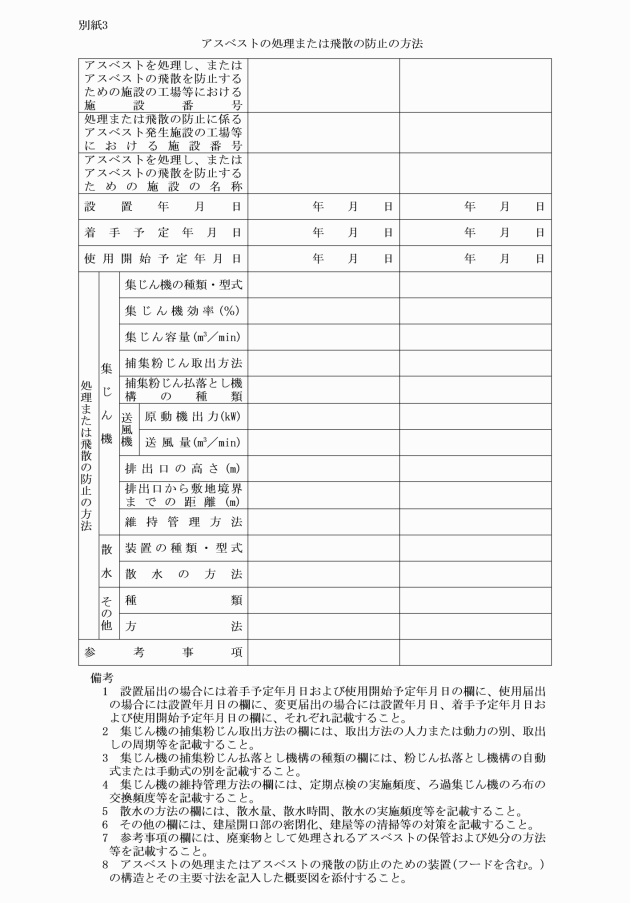 (3) アスベスト発生施設または特定粉じん発生施設を設置する工場等にあっては、次に掲げる事項