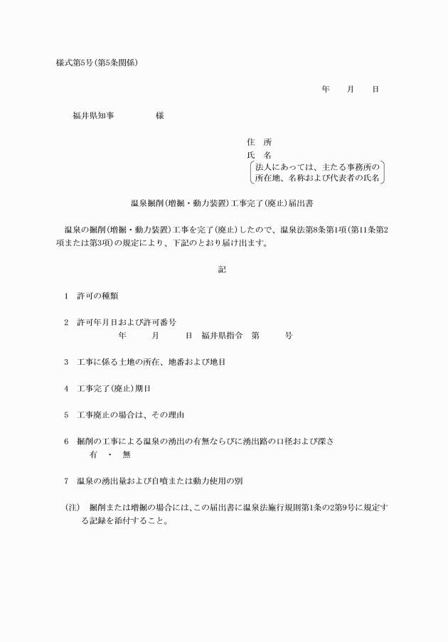 第5条 施行規則第5条の届出書は、温泉掘削(増掘・動力装置)工事完了(廃止)届出書(様式第5号)によるものとする。