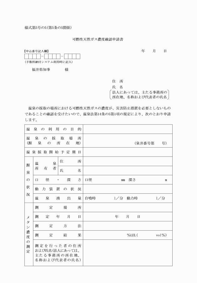 第5条の5 施行規則第6条の7第1項の申請書は、可燃性天然ガス濃度確認申請書(様式第5号の5)によらなければならない。