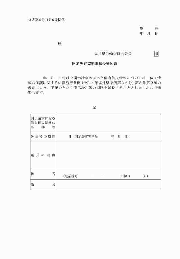 第6条 法施行条例第5条第2項の書面は、開示決定等期限延長通知書(様式第6号)とする。