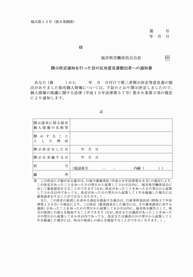 4 法第86条第3項の書面は、開示決定通知を行った旨の反対意見書提出者への通知書(様式第13号)とする。