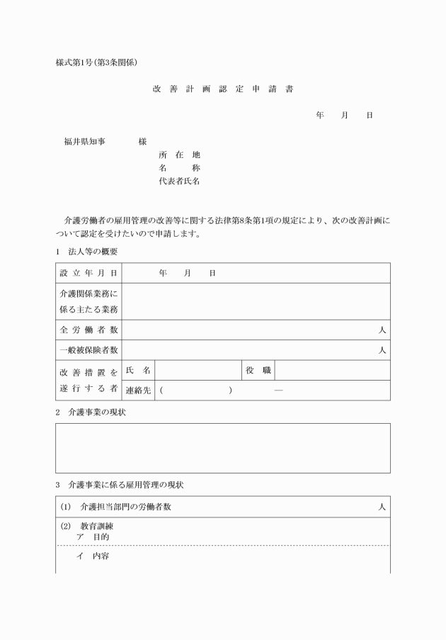 第3条 法第8条第1項の認定を受けようとする事業主は、改善計画認定申請書(様式第1号)を知事に提出するものとする。