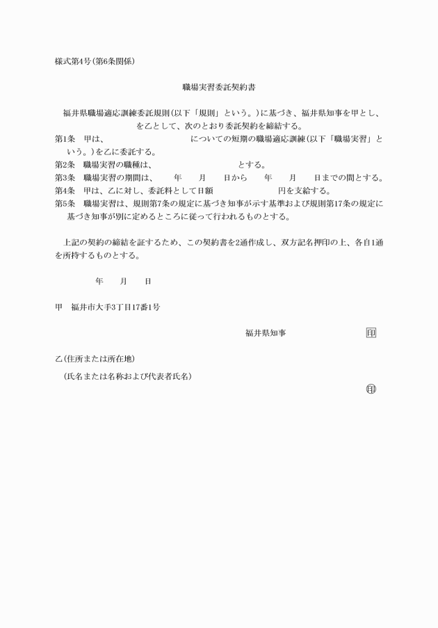 第4条 職場適応訓練を受けようとする求職者は、職場適応訓練申込書(様式第1号)を、当該職場適応訓練の受講の指示を行った公共職業安定所長を経由して知事に提出しなければならない。