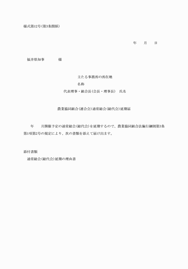 (2) 定款に定める時期に通常総会または通常総代会を開くことができない場合 農業協同組合(連合会)通常総会(総代会)延期届(様式第12号)
