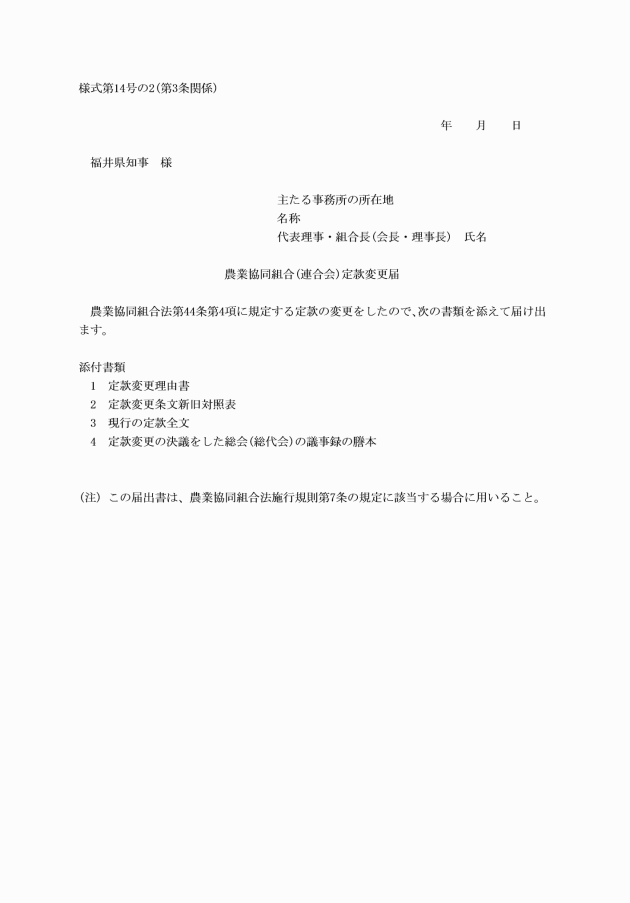 (4)の3 法第44条第4項に規定する定款の変更をした場合 農業協同組合(連合会)定款変更届(様式第14号の2)