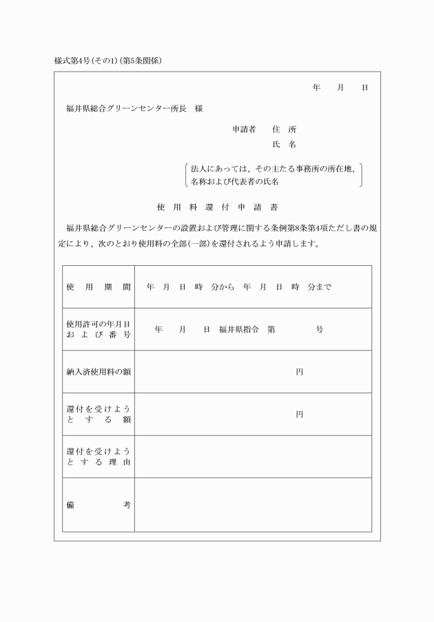 第5条 条例第8条第4項ただし書の規定による使用料または手数料の還付を受けようとする者は、使用料(手数料)還付申請書(様式第4号)によりセンター所長に申請しなければならない。
