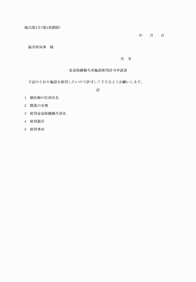 第1条 家畜保健衛生所使用料および手数料徴収条例(昭和25年福井県条例第61号。以下「条例」という。)第1条の規定により施設を使用しようとする獣医師は、家畜保健衛生所施設使用許可申請書(様式第1号)を知事に提出しなければならない。