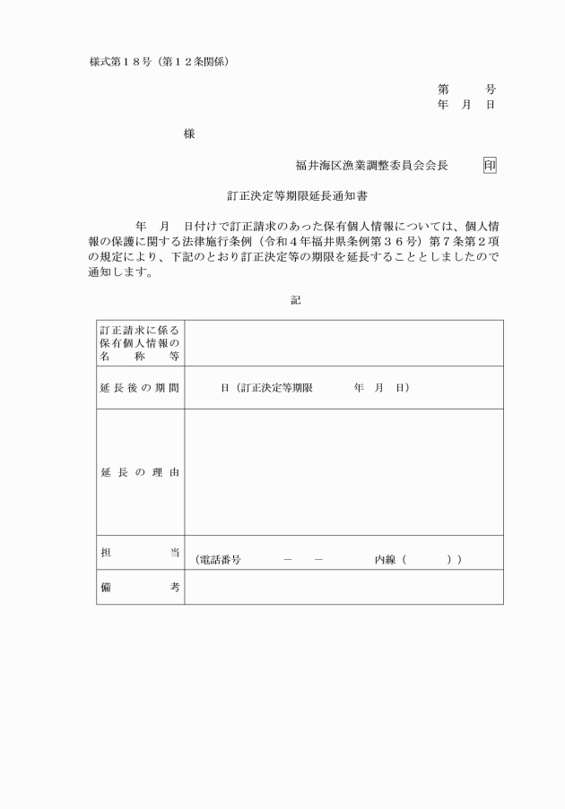 第12条 法施行条例第7条第2項の書面は、訂正決定等期限延長通知書(様式第18号)とする。