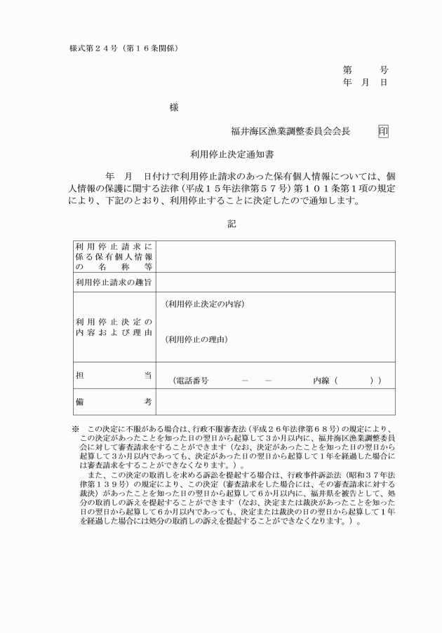 第16条 法第101条第1項の書面は、利用停止決定通知書(様式第24号)とする。