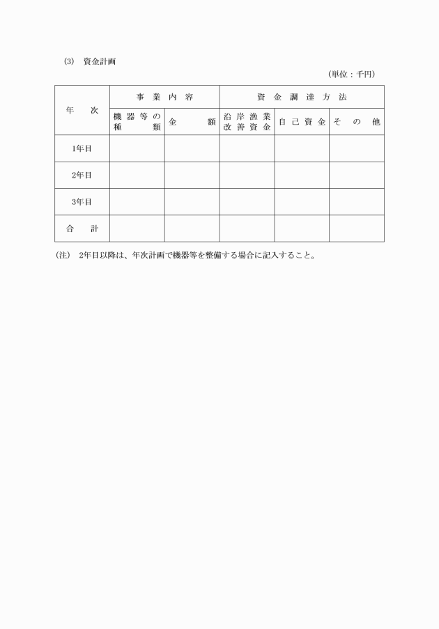 3 漁業経営開始資金 農林水産大臣が定める基準に基づき、青年漁業者またはその組織する団体が近代的な沿岸漁業の経営を自ら行う場合に当該経営を開始するのに必要な資金 | 青年漁業者1人または青年漁業者が組織する団体1につき2,000万円(ただし、知事が適当と認めるものにあっては5,000万円、1の区分された沿岸漁業部門の経営を行うものにあっては800万円) | 10年以内(農林漁業バイオ燃料法第10条に規定する資金の貸付けにあっては、12年以内) | 3年以内 |