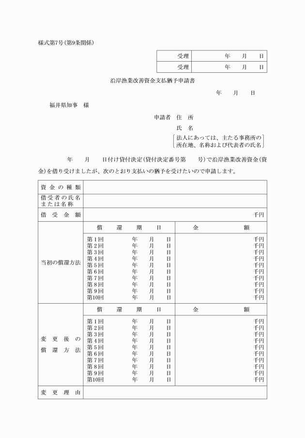 第9条 法第10条の規定により償還金の支払の猶予を受けようとする者は、沿岸漁業改善資金支払猶予申請書(様式第7号)に猶予を受けようとする理由となった事実を証明する書類を添え、償還期限(分割払の場合における各支払期日を含む。)の30日前までに、知事に提出しなければならない。