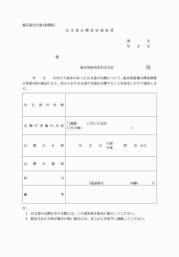 (1) 公文書の全部を公開する旨の決定 公文書公開決定通知書(様式第2号)