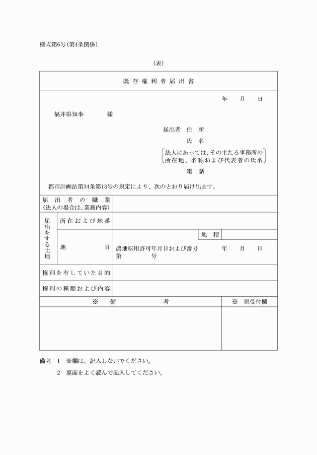 第4条 法第34条第13号の規定による既存の権利者の届出は、既存権利者届出書(様式第6号)により行うものとする。