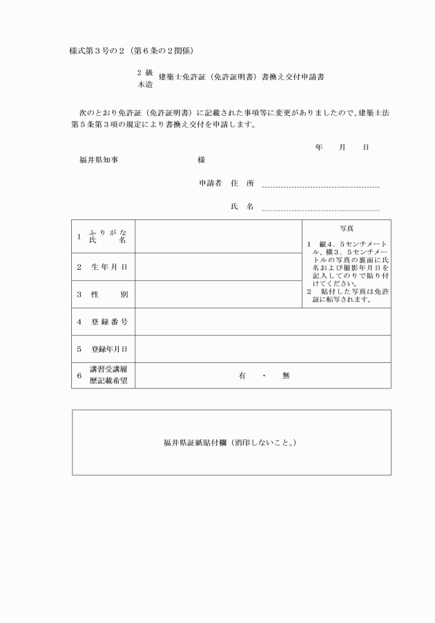 第6条の2 2級建築士または木造建築士は、法第5条第3項の規定により免許証の書換え交付を申請しようとするときは、免許証用写真を貼付した2級(木造)建築士免許証(免許証明書)書換え交付申請書(様式第3号の2)に免許証または免許証明書を添えて、知事に提出しなければならない。