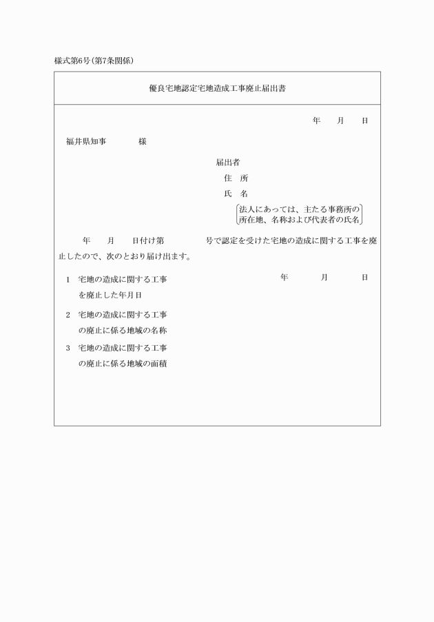 第7条 優良宅地の認定を受けた者は、当該優良宅地の認定に係る宅地の造成に関する工事を廃止したときは、遅滞なく、優良宅地認定宅地造成工事廃止届出書(様式第6号)により、その旨を知事に届け出なければならない。