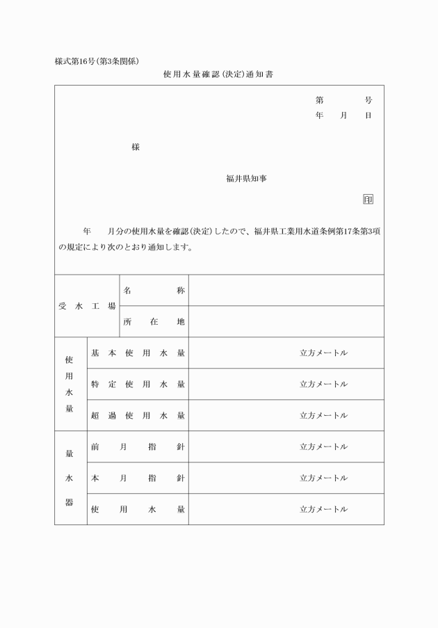 第1条 この規程は、福井県工業用水道条例(昭和50年福井県条例第26号。以下「条例」という。)の施行に関し、必要な事項を定めるものとする。