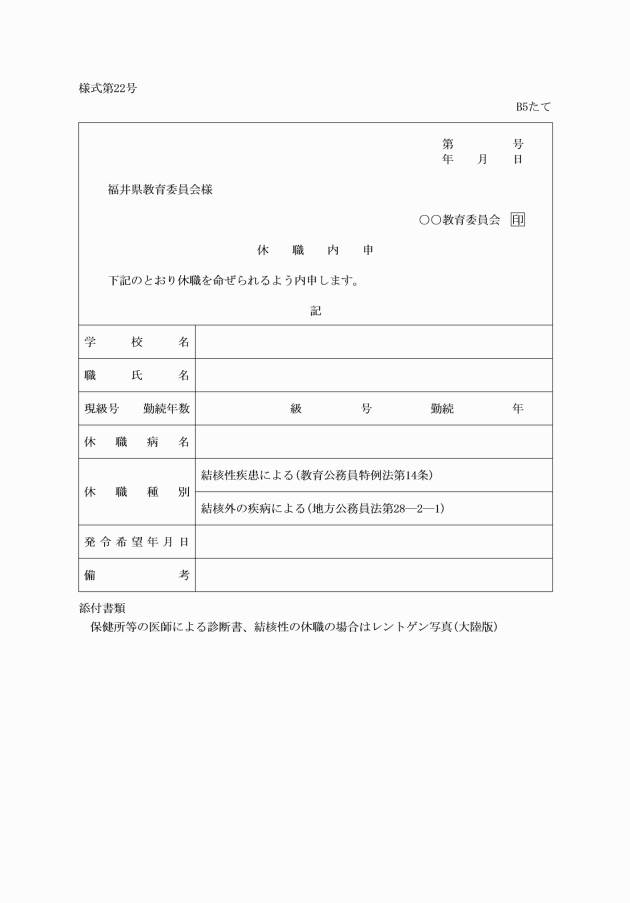 第29条 職員を休職させようとするときの内申書は、様式第22号によるものとする。