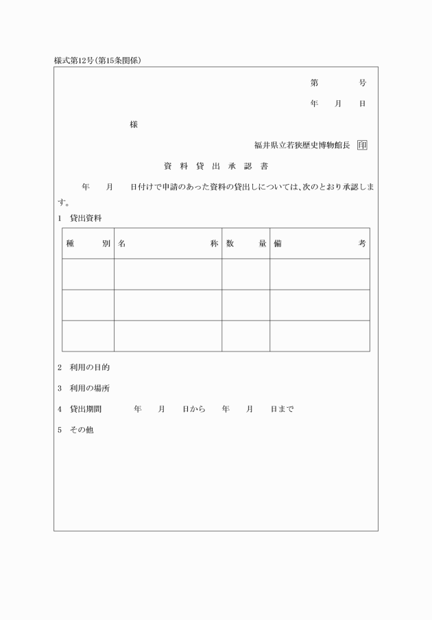第12条 博物館に若狭地方の歴史、民俗等に関する資料(以下「資料」という。)を寄贈または寄託しようとする者は、資料寄贈(寄託)申込書(様式第9号)を館長に提出しなければならない。