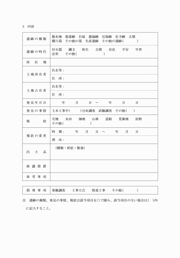 第30条の3 法第93条第1項の規定による発掘をしようとするときの届出は、埋蔵文化財発掘届出書(様式第20号の3)を提出してしなければならない。